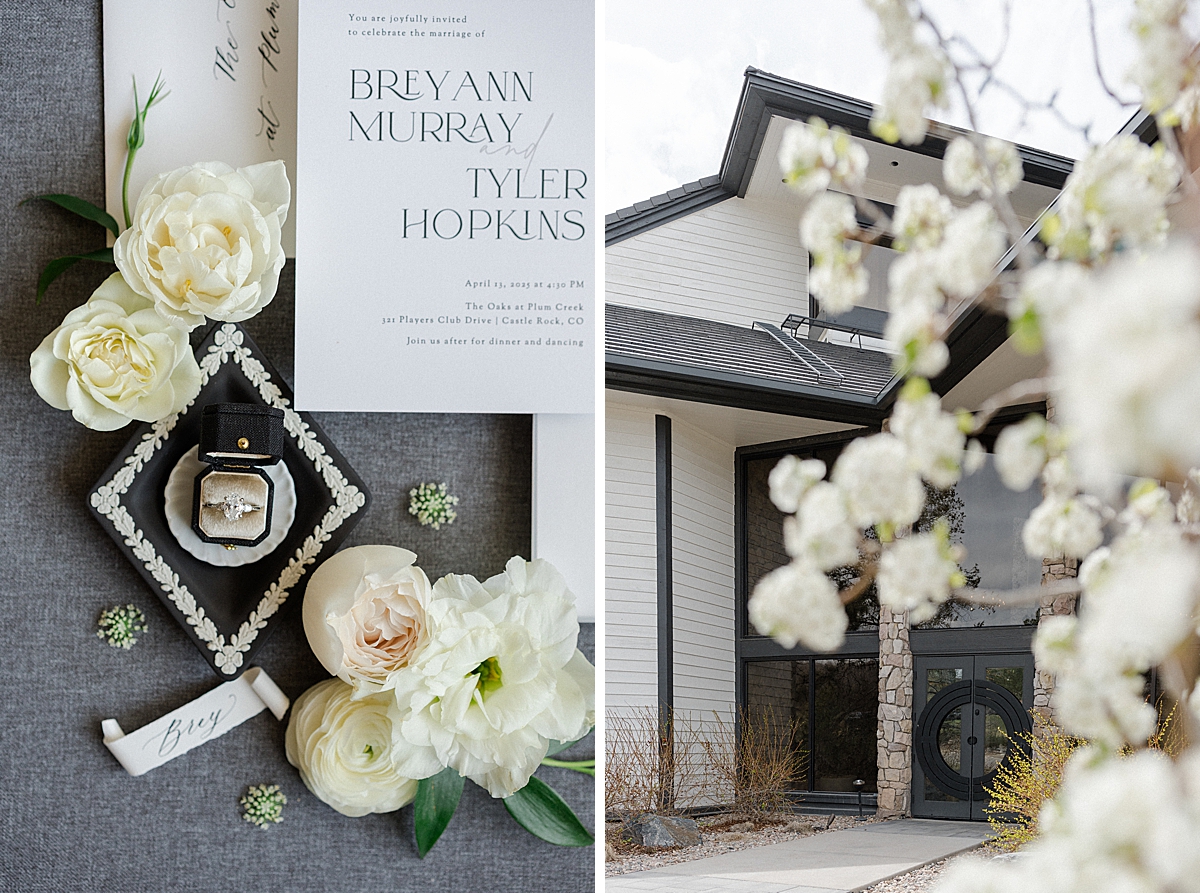 Brey and Tyler’s wedding at The Oaks at Plum Creek was the perfect blend of modern elegance and pure fun. Set in Castle Rock, this recently renovated venue offered the ideal backdrop for their minimalist black and white celebration.